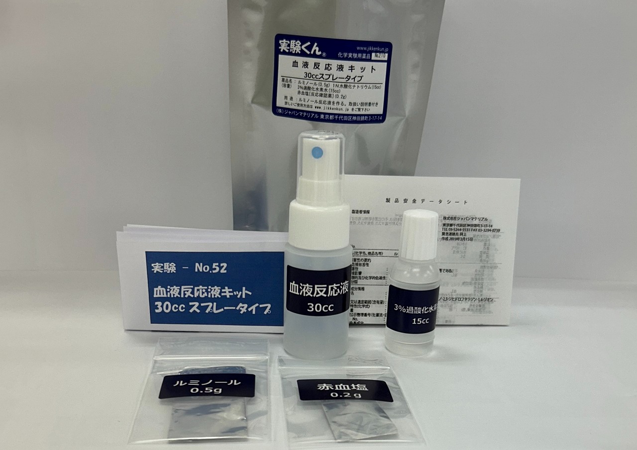 必要な薬品:実験くん薬品No.210には、必要な薬品(ルミノール0.5g、1N水酸化ナトリウム15cc、3%過酸化水素水15cc、赤血塩[反応確認薬]0.2g)と器具がすべてセットされています。
